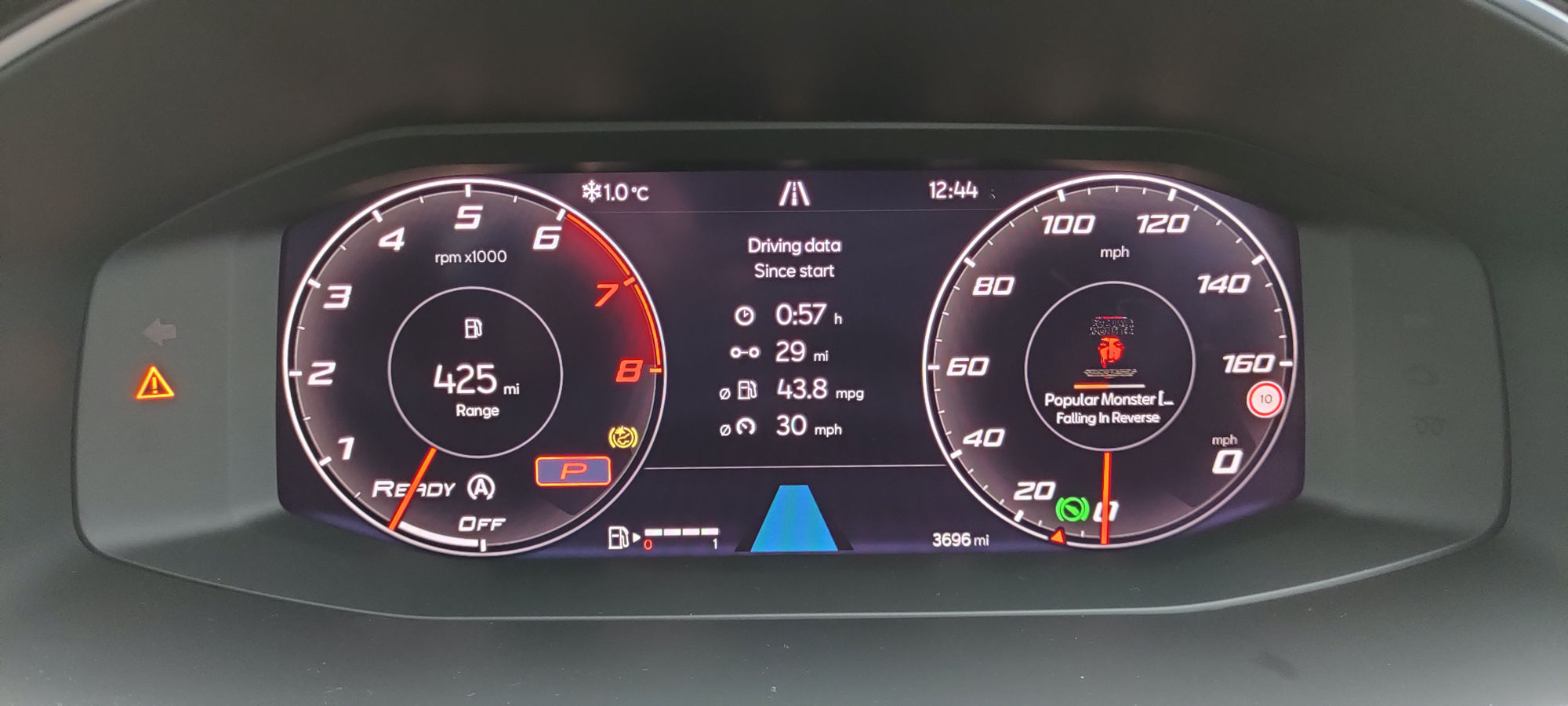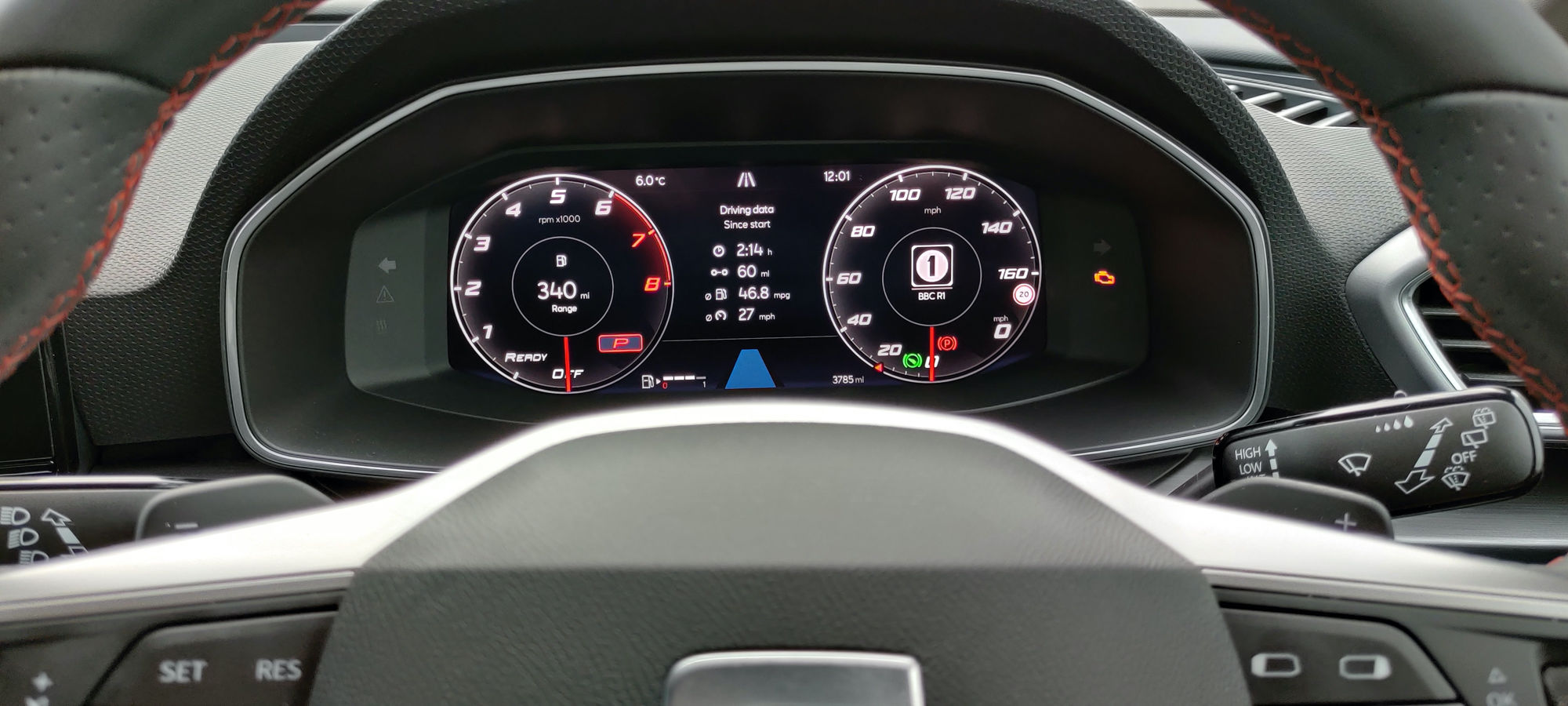 Due to my MK3 Cupra having a digital dash I didn’t expect much change in the MK4 version, first impressions you can immediately notice that the gauges on the sides in the MK3 are now incorporated to give the 10.25” screen room to shine. The screen itself isn’t too shabby in spec’s (1280 x 480 pixels, 133 dpi), it is easily readable in all weathers (which I experienced during my time with the car).