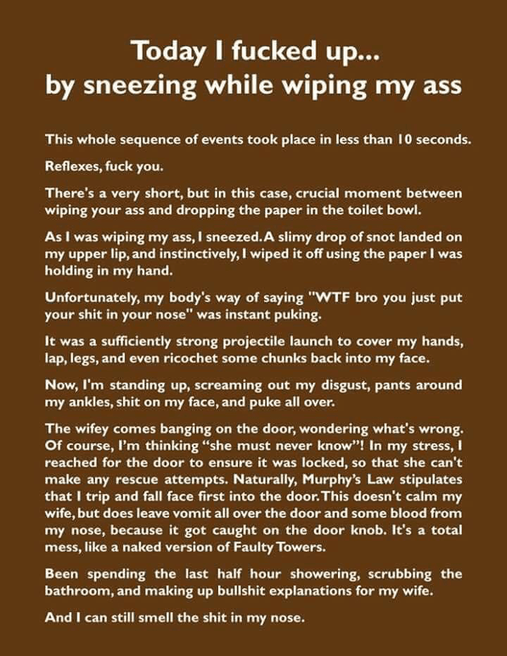 Horrified, she asked me if I ended up in intensive care because the dog food poisoned me. I told her no, I stepped off the kerb to sniff an Irish Setter's arse and a car hit me.