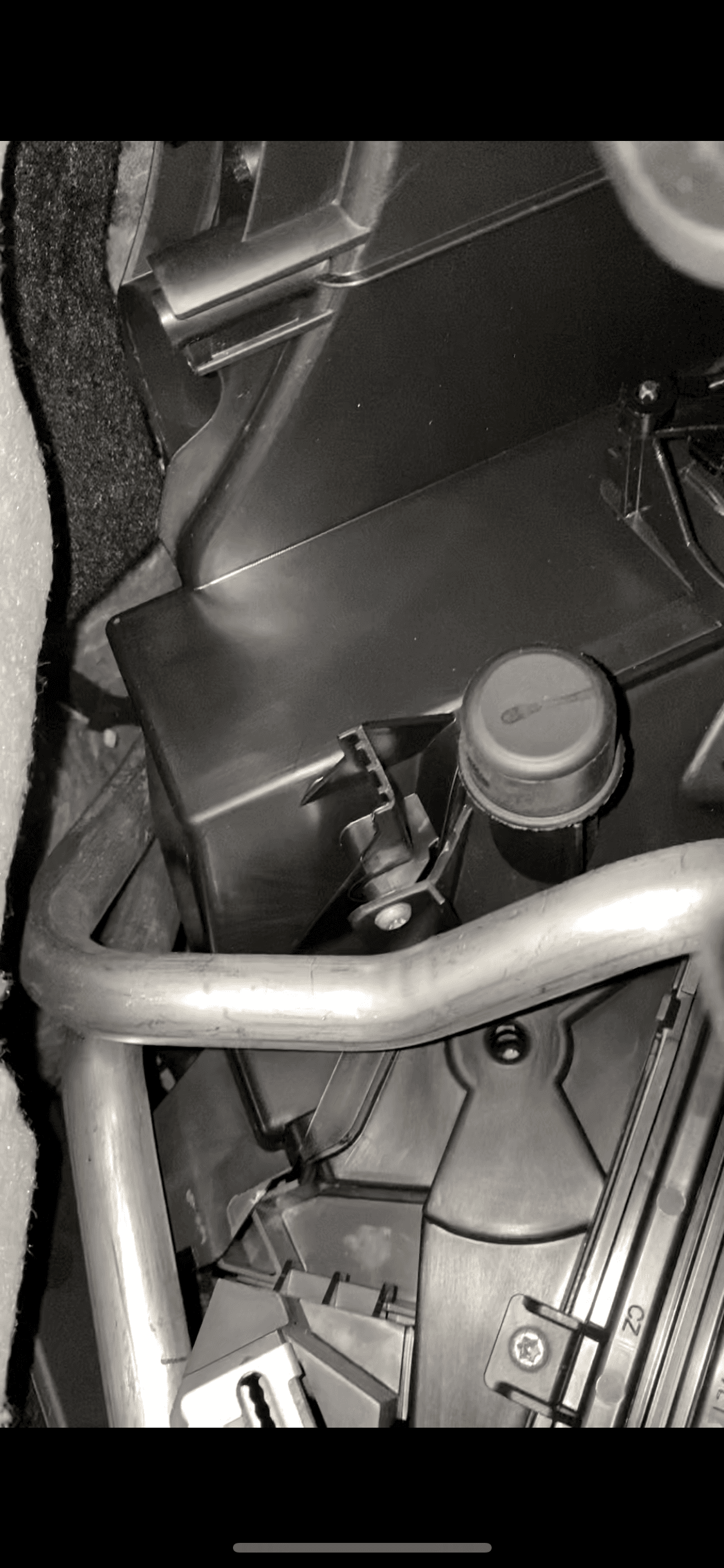 I have managed to find the condensate drain pipe, as mentioned it is on the drivers side behind the foot rest.