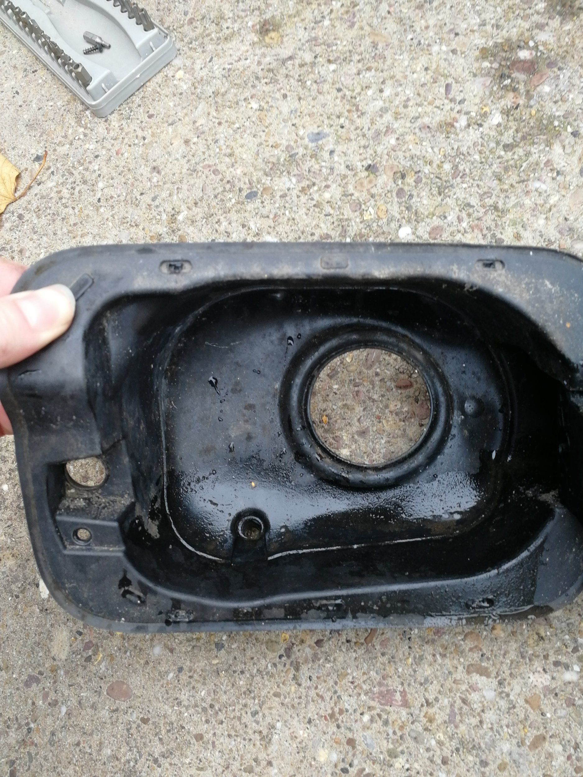 There's a plastic tube which attaches to the black surround.Any fuel spill runs away through it.