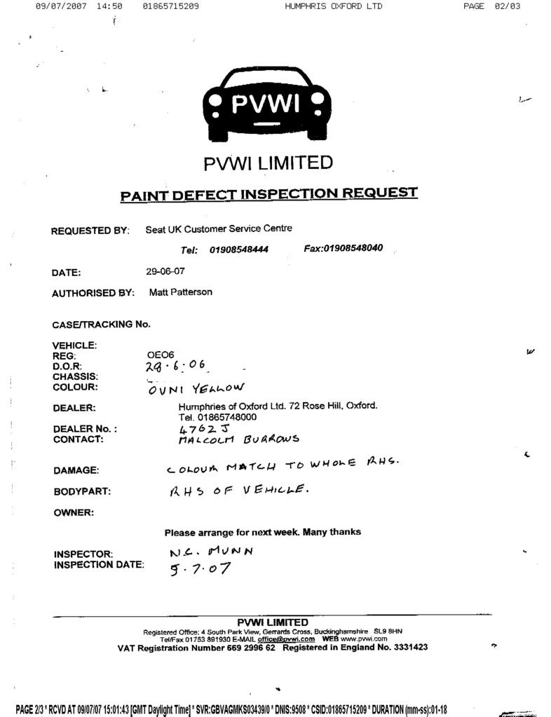 Service Manager stated that all warrenty claims are directed straight away to the warrenty department for processing on 4 seaparate occaisons I contacted SEAT and they didn't contact the warrenty department! I spoke to VBRA the Vehicle Builders Association and it does not fall under their remit. Next is Which and Watchdog I think as I've spoken to the Citizens Advice Bureau and they suggested having the inspection done as evidence.