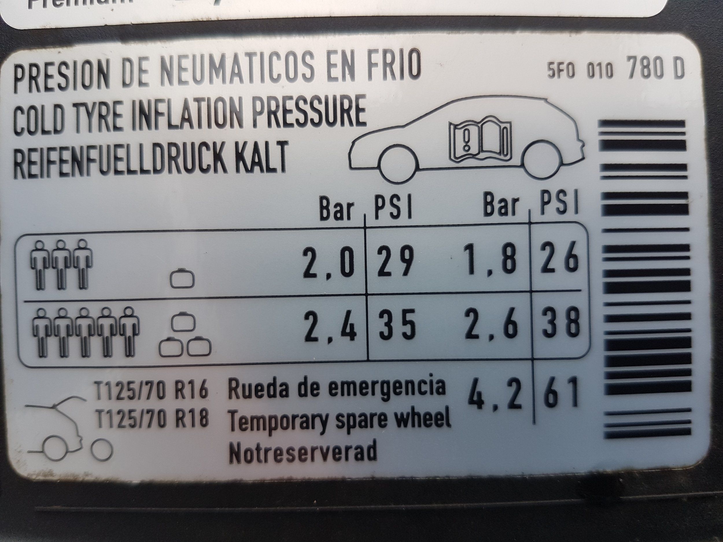 Can anyone who has a MK3 Leon Cupra that came with 18" wheels, please let me know what pressures are quoted on the "tyre pressures label/sticker" please, I searched for what the pressures SEAT advise but have drawn a blank, even the driver's handbook and workshop manual suggest that the pressures listed on the label stuck to the car during productions are where you find this info - my daughter's car came with 19" alloys and I've fitted 18" with the correct tyres for use in winter.