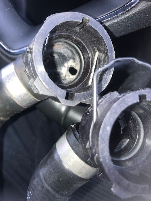 A couple of months later my low coolant warning flashed up (about 85K miles): traced to failure of an auxiliary pipe attachment which feeds off the heater at the bulkhead. On inspection the inside of the hose fitting was eroded to the point it perforated and snapped; the grit that was in the system must have