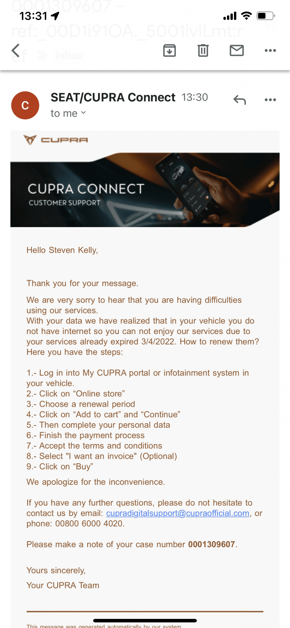 Reply from cupra, although it’s working and I’ve not renewed since the app etc since tge 3/4/22